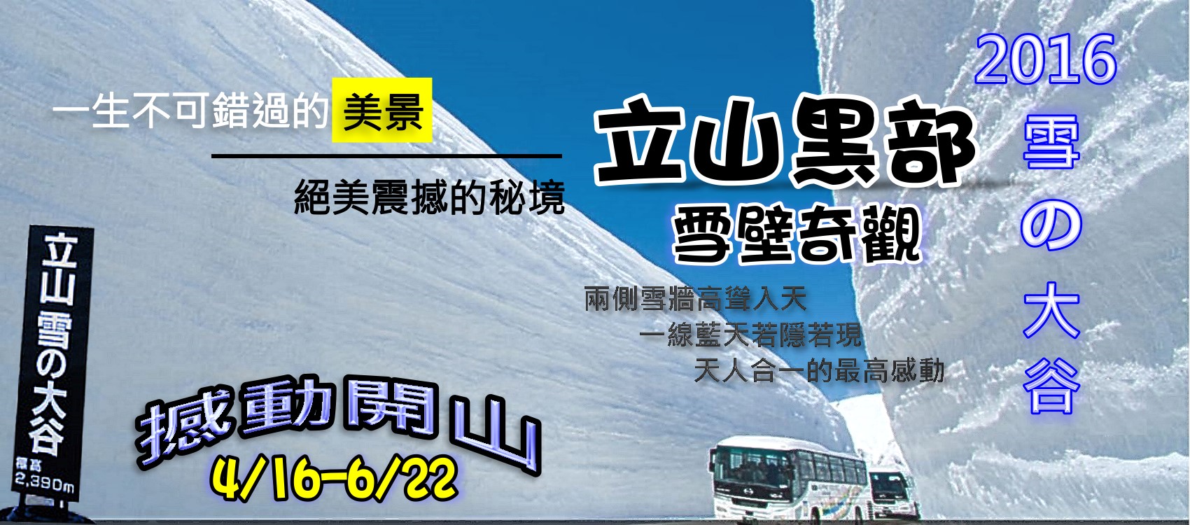 立山連峰和黑部峽谷連成的阿爾卑斯山脈路線(Alpen Route)於1971年完工,是國際級的山岳觀光線。每年10月之後,立山被冰雪覆蓋,並展開長達半年的封山期。一直到隔年4月初,立山黑部觀光鐵道會利用巨型剷雪車,在雪地中闢出一條車道,兩旁高達20公尺的雪牆,自然與人工結合的磅礡景觀,猶如摩西開海再現,是觀光客驚呼連連的奇景。 每年開山後,在立山天狗平至室堂平間的道路,會舉辦「漫步大雪谷活動」,讓遊客行走雪牆其間,每年都吸引近10萬人慕名而來。趕快來立山黑部感受冬盡春來的暖意,和雪壁的震撼魅力吧! (順便解釋一下,到底是黑部立山,還是立山黑部,其實這兩種說法都對。因為他是由立山、黑部兩個地名組合起來的。如果你像我是從黑部橫越到立山的,就可以叫黑部立山,反之就是從立山到黑部,就叫立山黑部,以上真的不是繞口令...-.-") 2016年的開山期間為2015年4月16日-11月30日,而雪之大谷開放期間為2016年4月16日-6月22日。 2016立山黑部開山時間 ▶ 2015年4月16日~11月30日 漫步雪之大谷2016 ▶ 期間:2016年4月16日~6月22日